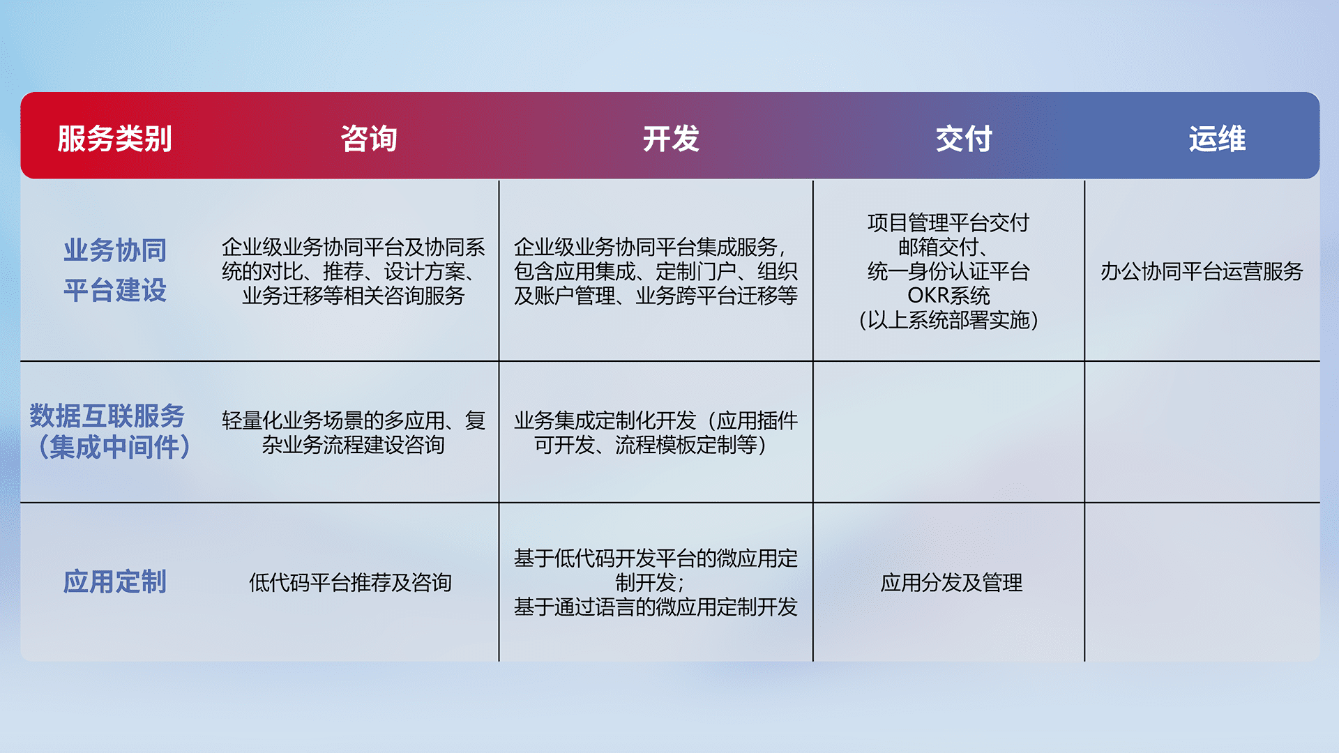 针对钉钉、、企微、、IDaas等平台级产品提供产品的规划、、、方案、、、交付、、、、定制化开发等服务,,实现如统一协同办公、、、智能客户服务、、、混合会议管理、、、、智能数据查询、、、等业务场景,,,实现数字化转型。。。。