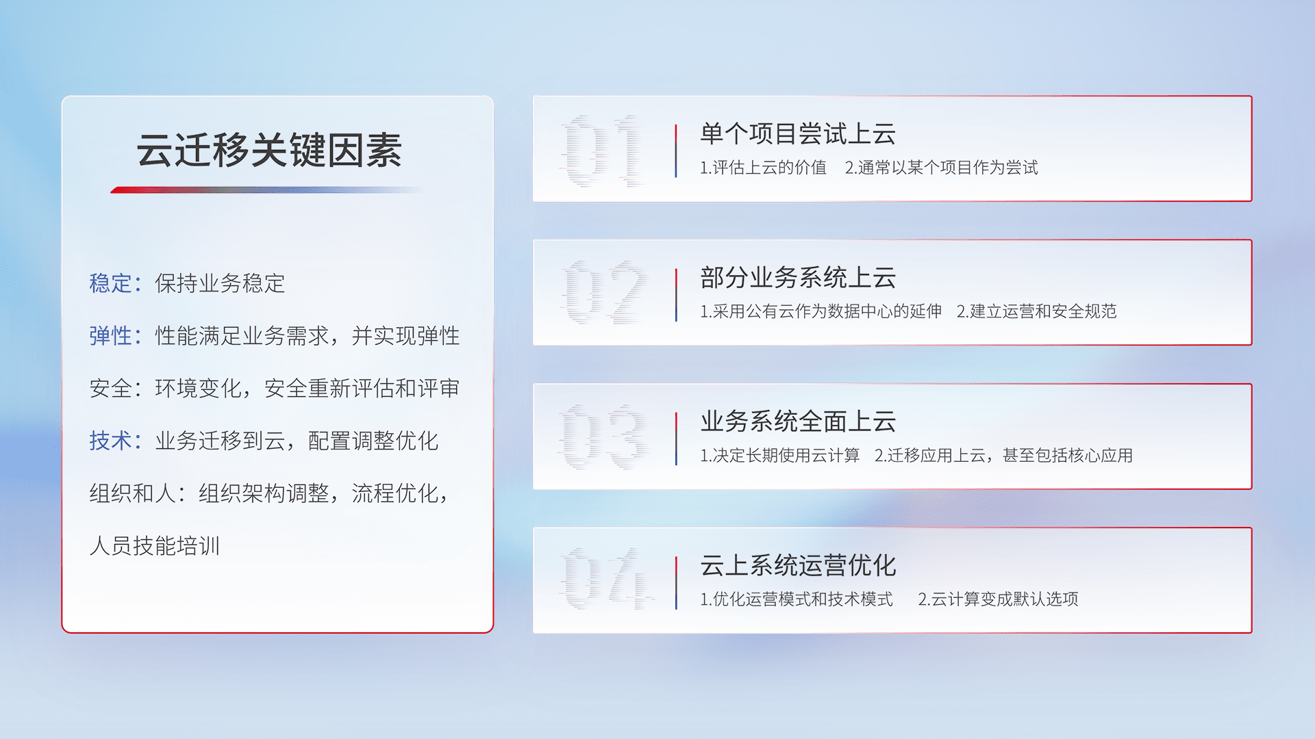 结合实际业务,,,,从规划设计、、、、云平台选型、、、云原生改造、、数据迁移、、、集成交付,,,迁移全过程为客户识别最佳上云路径,,,做好风险识别管理,,,,设计网络架构、、身份权限、、、、安全审计合规、、、操作审计、、日志审计、、、、监控告警策略、、、、多站点容灾设计等,,,,对云上基础设施进行整体规划,,,提升IT治理水平,,,,以满足弹性、、、、高可用、、高性能的需求。。。。