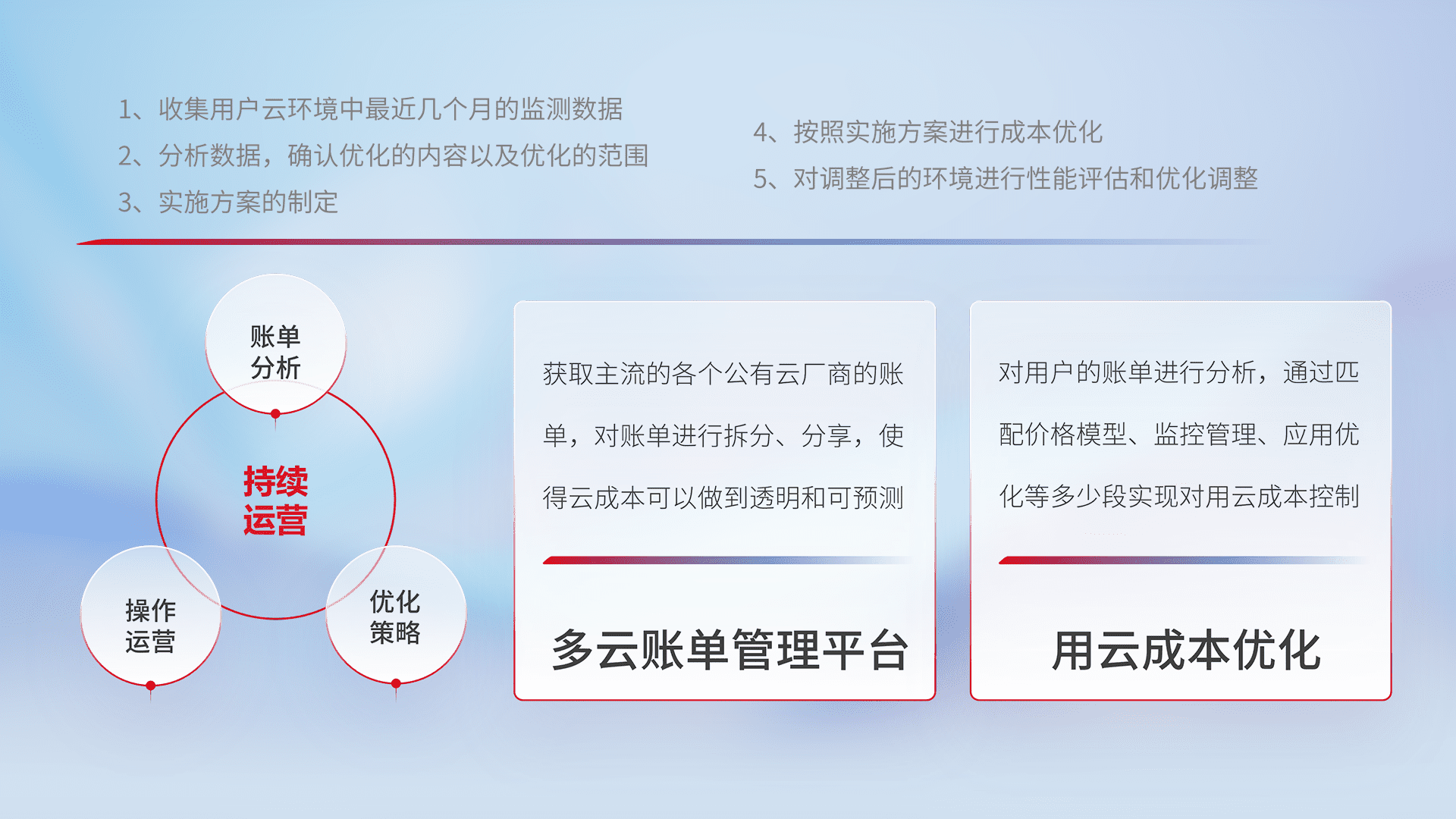 通过多云纳管,,,,以统一的资源数据模型把客户的云资源进行抽象和封装,,,进而实现对多云资源的统一操作,,,,保障云资源管理的可靠性、、稳定性与可用性。。量身定制化运维内容,,,,配置、、、、开发运维、、、、补丁管理、、、、备份、、监控、、、认证和访问管理、、、审计和日常巡检等,,保障在用云过程中的可靠度,,,,稳定度以及高可用率。。